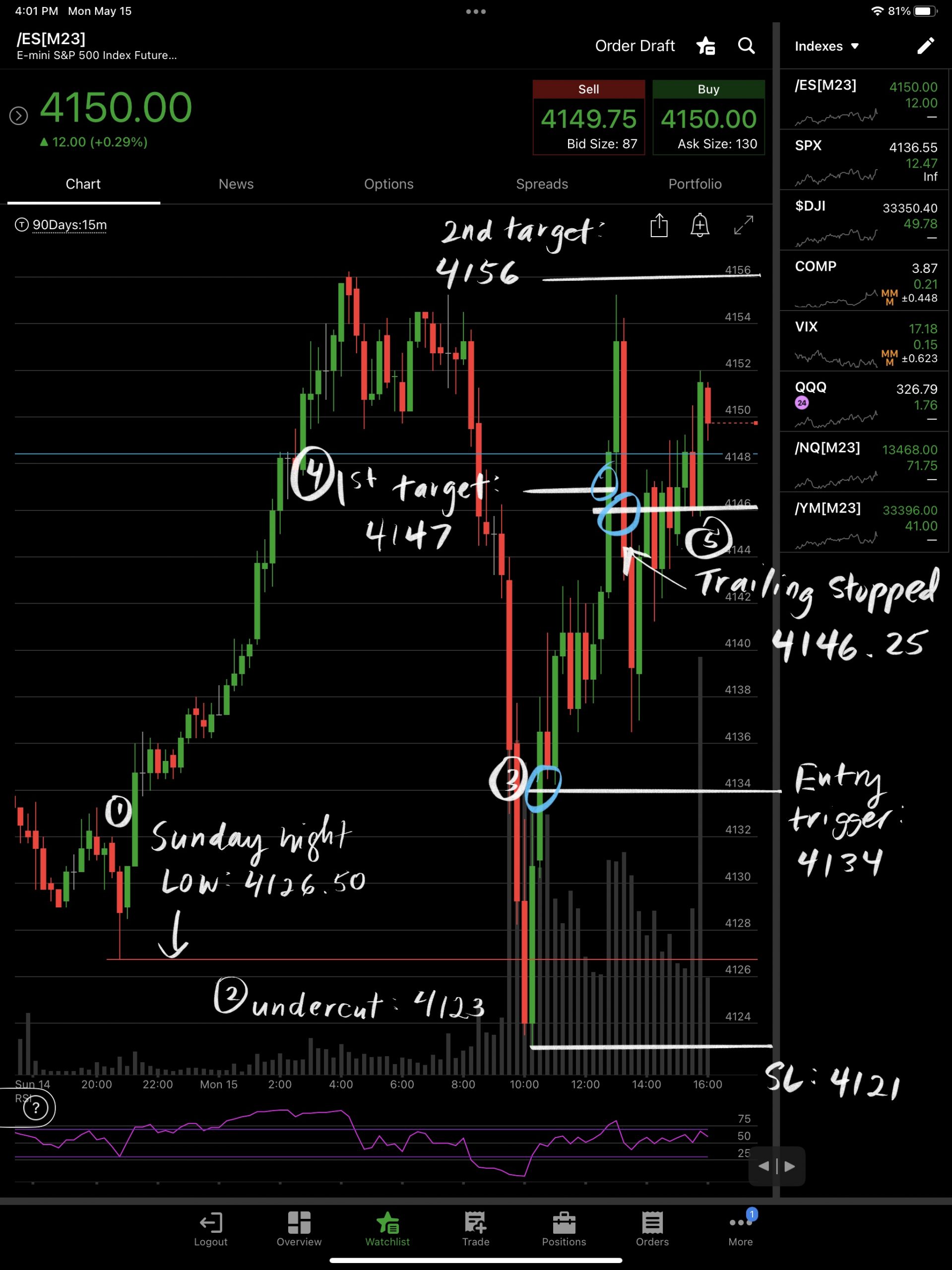 ES tanked after the bell and dipped below the overnight low all the way to 4123. On the hourly (and even the 30 min) chart, there was a nice wick back up. Normally, I would have set an entry +5 points from the previous low, but Mancini had mentioned the 4134 level as a possible entry point in his substack over the weekend, and since it was only 1 point up from where I would have entered, I decided to go with his entry instead for extra safety and also because he’s the GOAT.